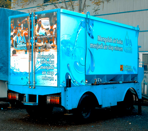 IPA Mobile adalah sarana mengolah air baku atau air non payau/gambut menjadi air siap minum dengan sistem mobile. Sangat cocok untuk ditempatkan pada daerah rawan air atau daerah bencana. IPA Mobile didesain dengan sistem pengolahan lengkap (Flokulasi, Koagulasi, Sedimentasi dan Filtrasi) dengan kapasitas 1,5 – 2 L/detik, dilengkapi sistem ultra ?ltrasi dan ultra violet ?ash ozon untuk dapat menghasilkan kualitas air siap minum.